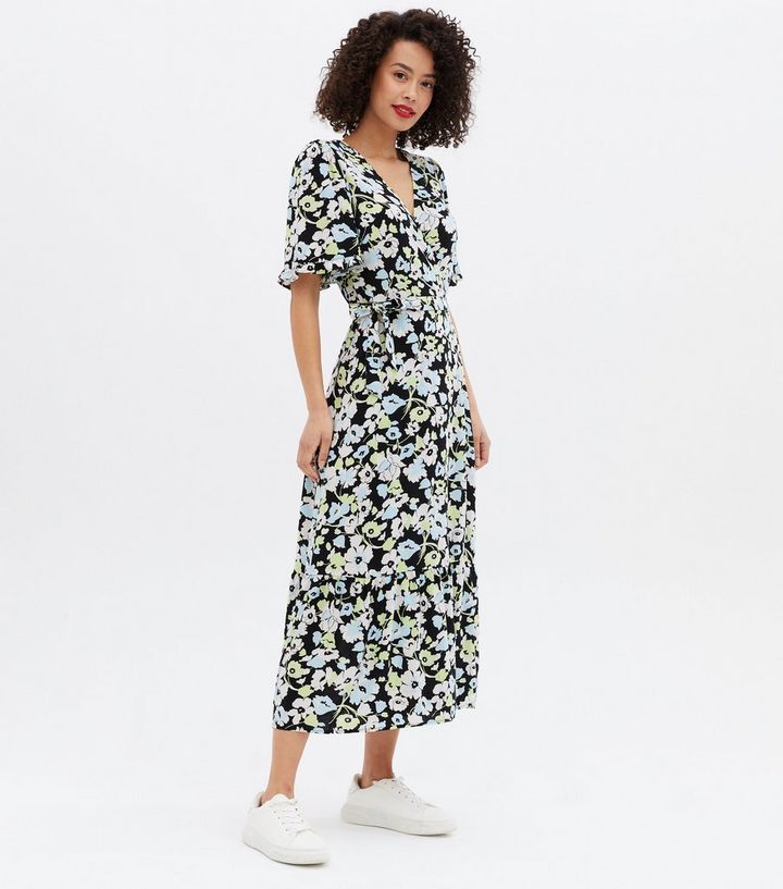 Tall Black Floral Tiered Midi Wrap Dress New Look