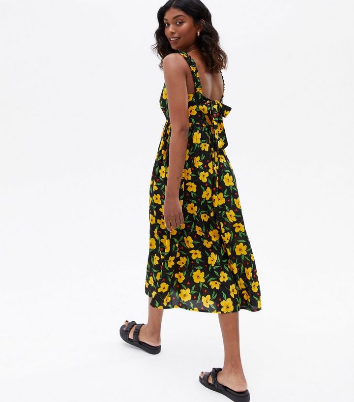 Black Floral Shirred Strap Midi Dress New Look